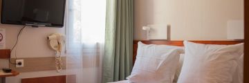 Our Single rooms, with a surface area of 12 m², are ideal for solo travelers. They feature a 140 cm double bed, a bathroom with shower and hairdryer, as well as a courtesy tray. Our Comfort Double rooms, also 12 m², can accommodate up to two adults and one child, with a shower or bathtub depending on availability, for a practical and comfortable stay.