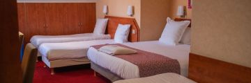 Families also have several suitable options. Our quadruple rooms, around 22 m², can accommodate up to four adults thanks to a layout designed for family stays. Our 5-person room, more spacious at 25 m², is an ideal solution for families or small groups wishing to stay together while enjoying a high level of comfort.